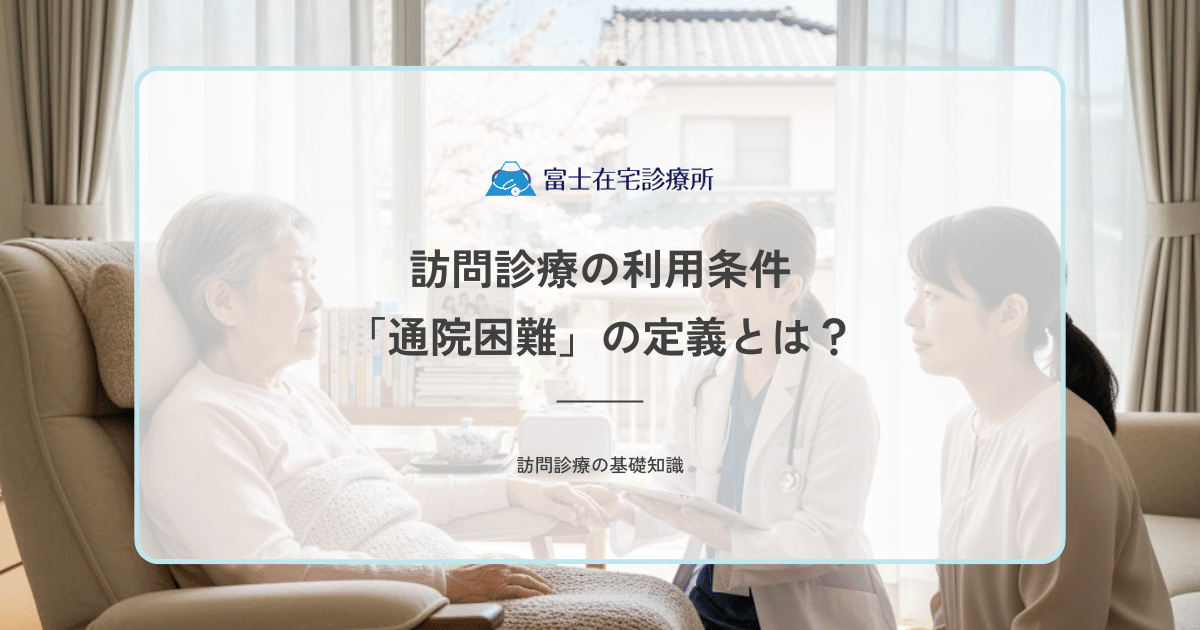 訪問診療の対象となる通院困難の定義を解説しています。医師が判断する身体機能や認知症、生活環境の基準を具体例と共に紹介。一人での外出が難しい高齢者や家族の負担が限界な世帯が、安心して在宅医療を選ぶための指針を提示します。 -